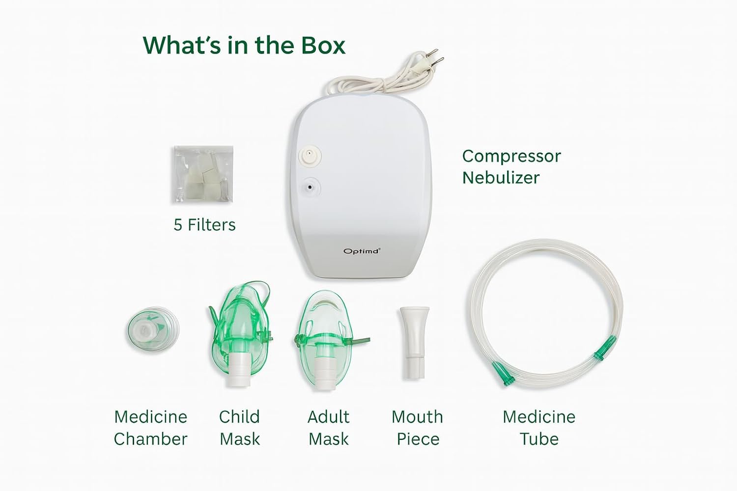 Disclaimer: This product should be used only as directed by a physician. Always read the instruction manual carefully before use.The Optima Smart Compressor Nebulizer Machine is a reliable and efficient solution for respiratory care at home, suitable for both adults and children. Designed to deliver prescribed medication in the form of a fine aerosol mist, it helps provide effective relief from cold, cough, asthma, bronchitis, and other breathing difficulties, as advised by a healthcare professional.Equipped with an oil-free piston compressor, this nebulizer produces a fine mist of less than 5 microns, allowing medication to reach deeper into the lungs for better absorption and faster relief. Its stable airflow and steady pressure ensure consistent performance during every session.The compact and portable design makes it ideal for regular home use as well as travel. With simple one-button operation, it is easy to use for all age groups, including seniors. The low-noise operation (below 54 dB) ensures a calm and comfortable therapy experience, especially for babies and children, even during nighttime use.Built for convenience, the Optima Smart Nebulizer is easy to clean and maintain, supporting safe and hygienic usage over time. The complete accessory kit included in the box makes it ready to use right out of the box.