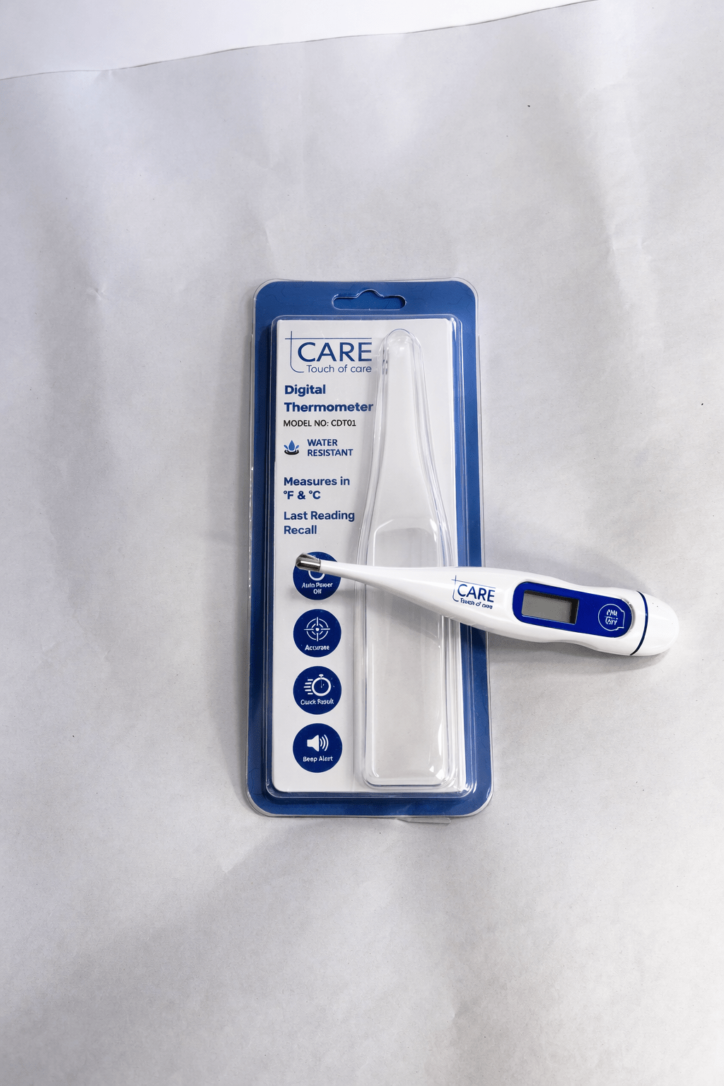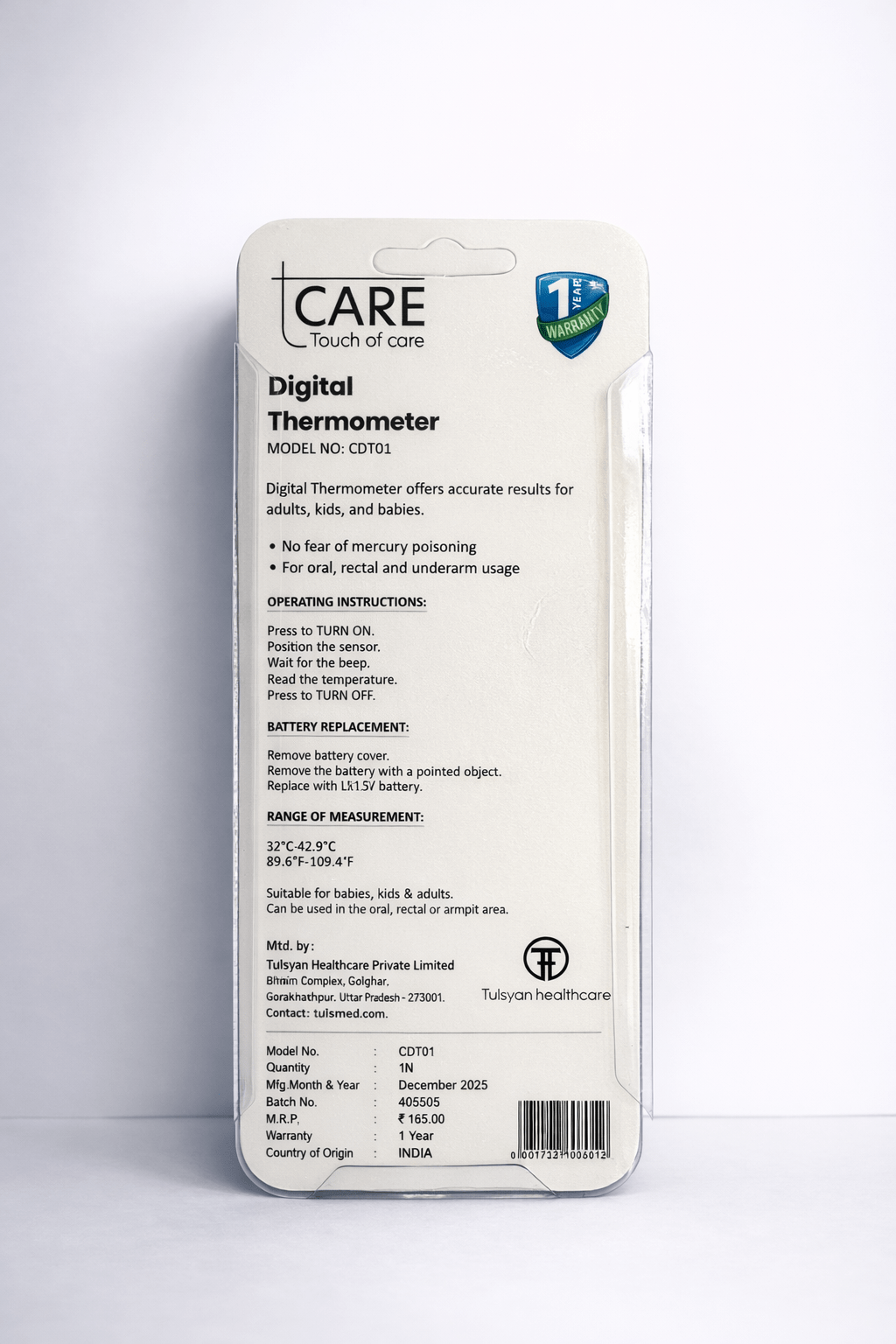 The tCARE Digital Thermometer CDT01 is a reliable and user-friendly device designed for quick and accurate body temperature measurement. Ideal for home use, clinics, and first-aid kits, this thermometer provides clear digital readings in both °F and °C, making it convenient for all users.