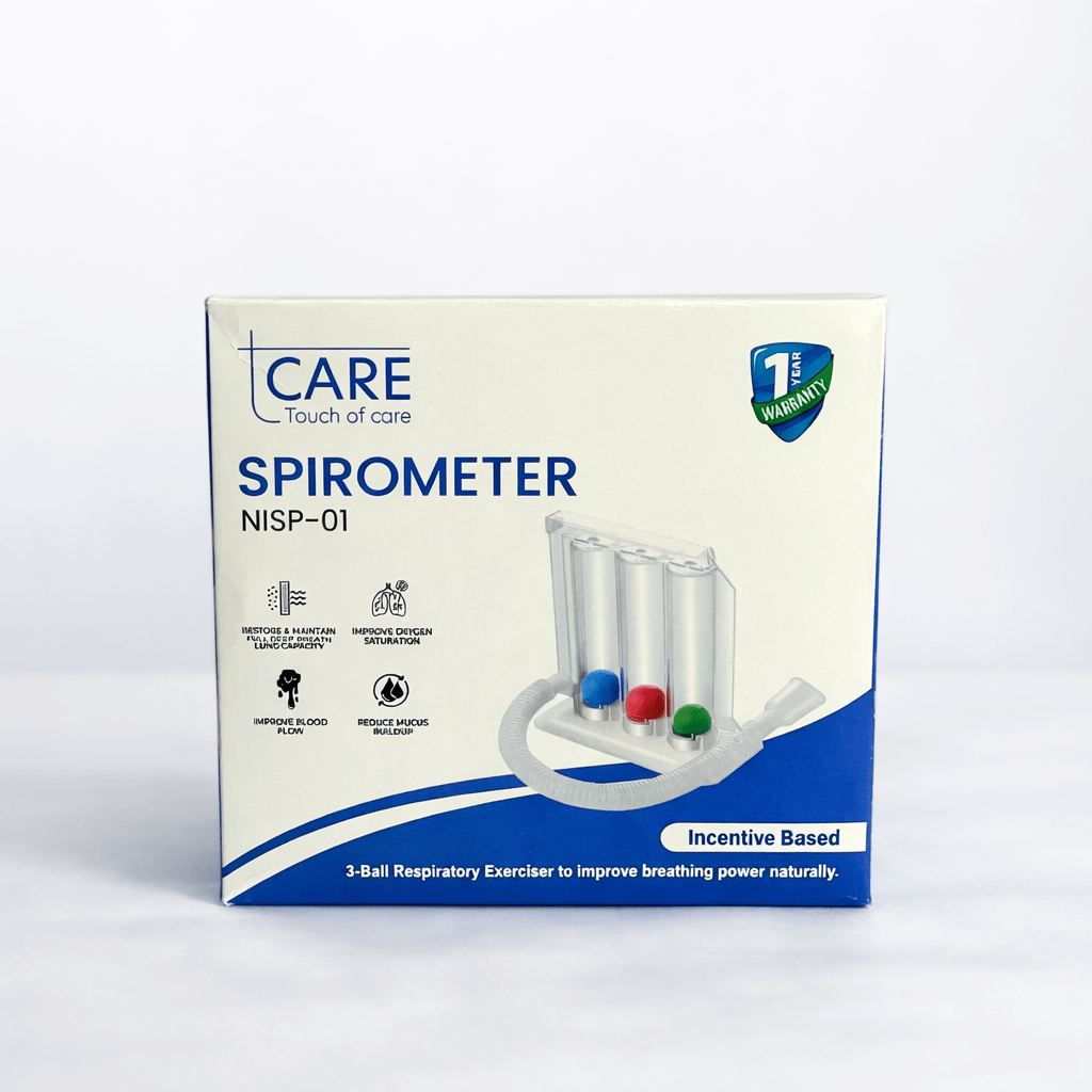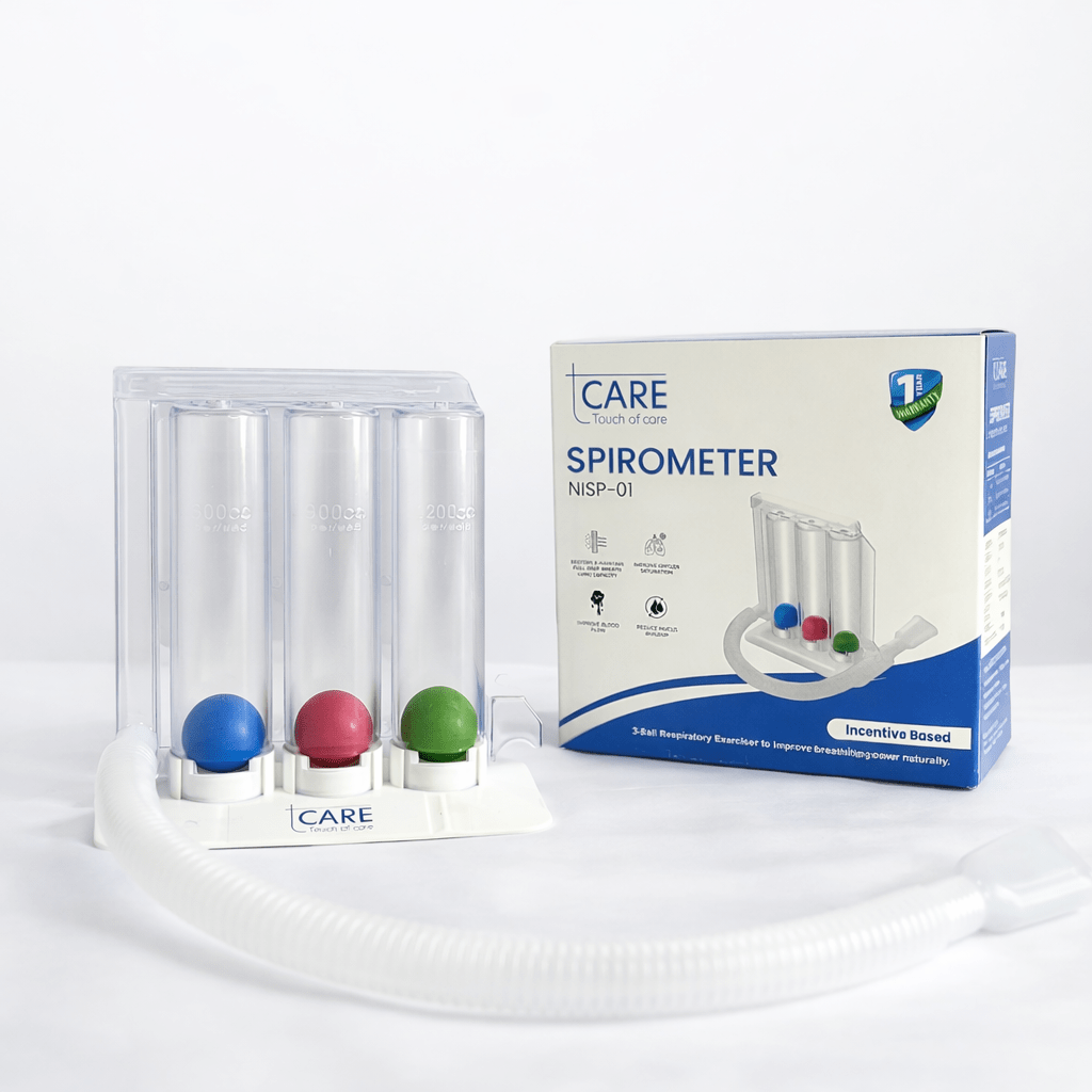 The tCARE Spirometer NISP-01 is an incentive-based respiratory exerciser designed to help improve lung capacity, breathing efficiency, and oxygen intake naturally. Ideal for post-surgery recovery, respiratory therapy, and general lung strengthening, this device encourages deep breathing exercises through a simple and effective 3-ball system.